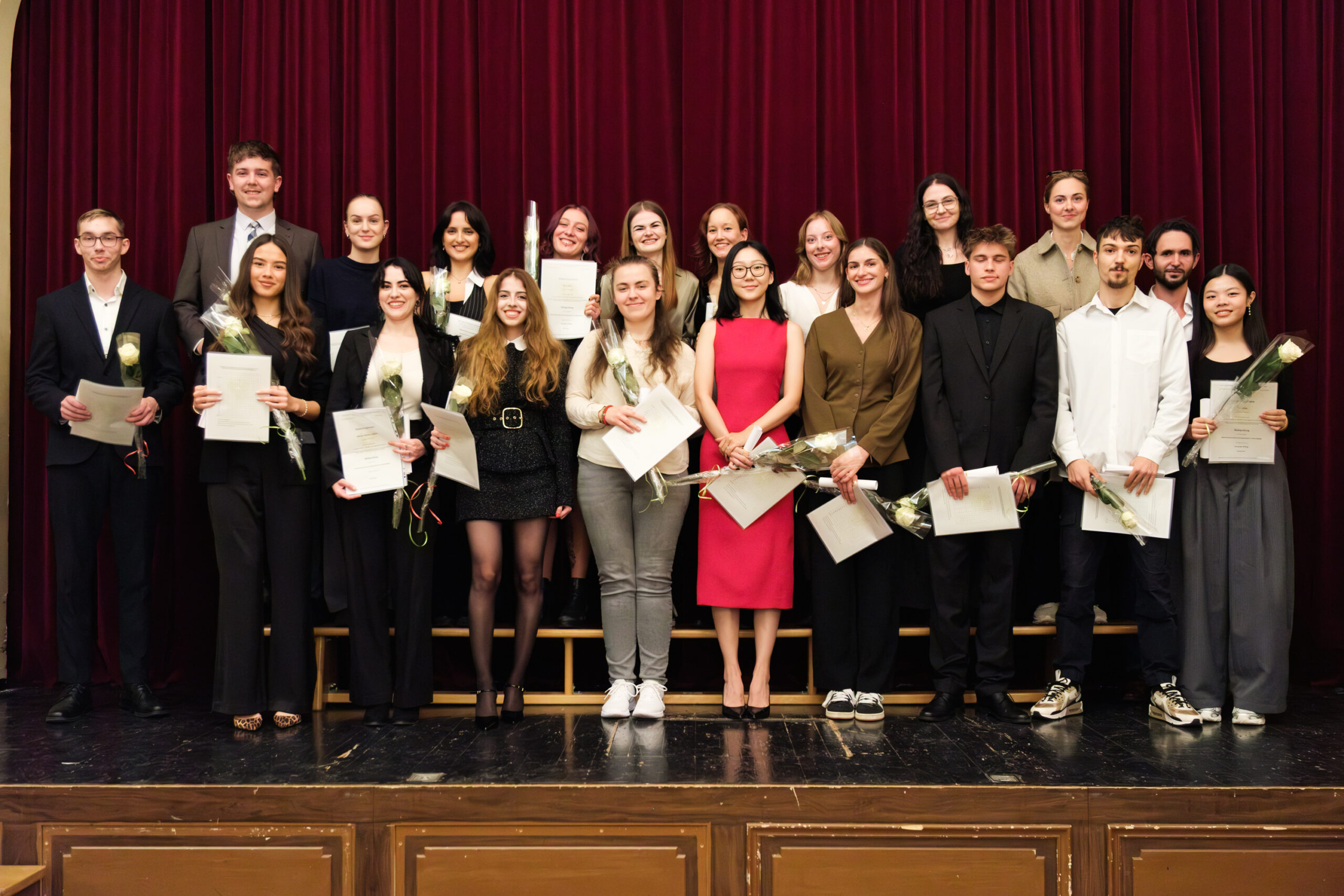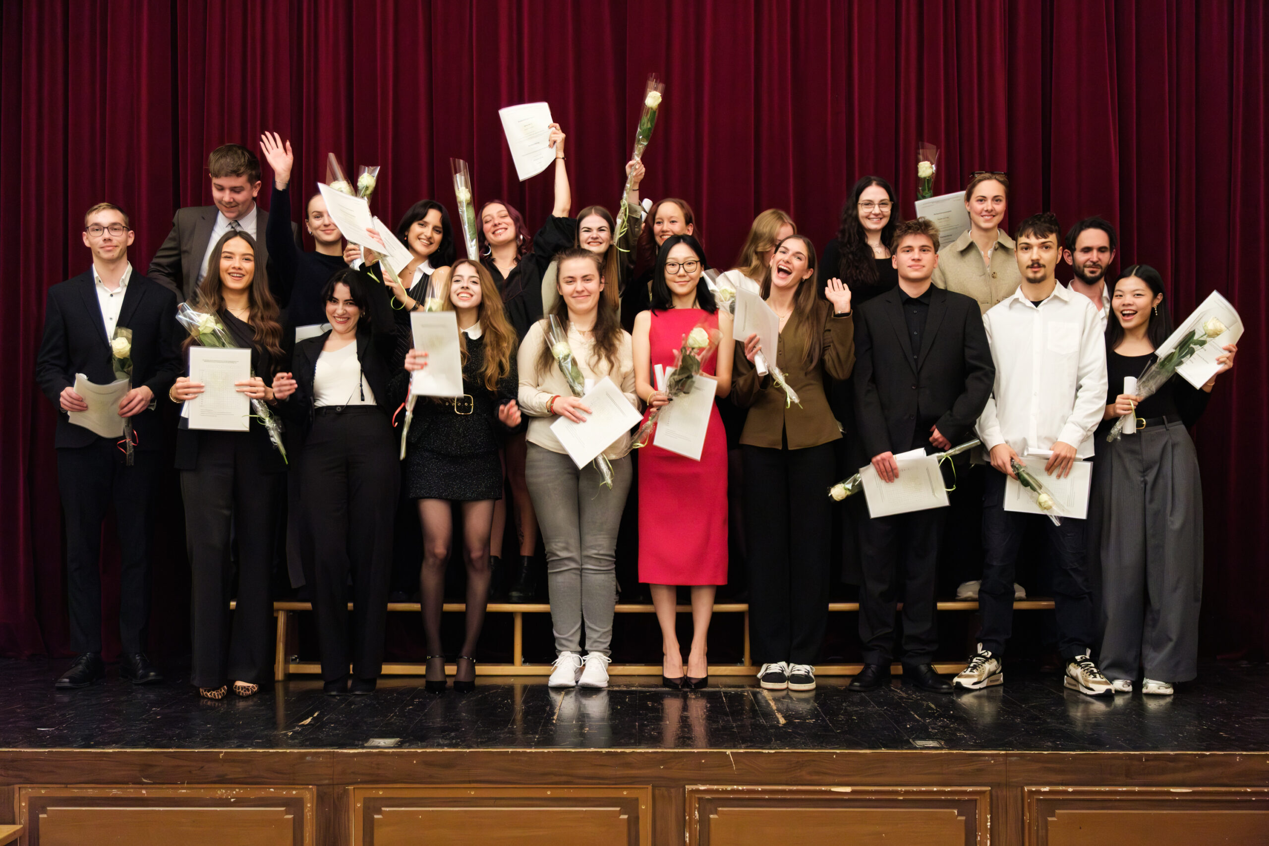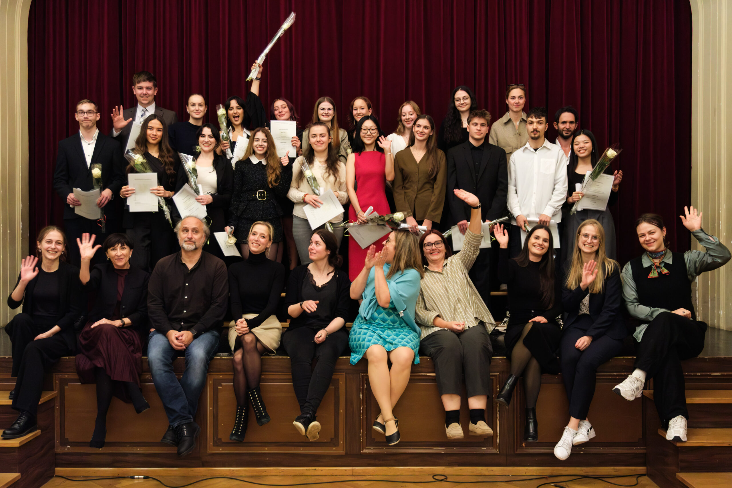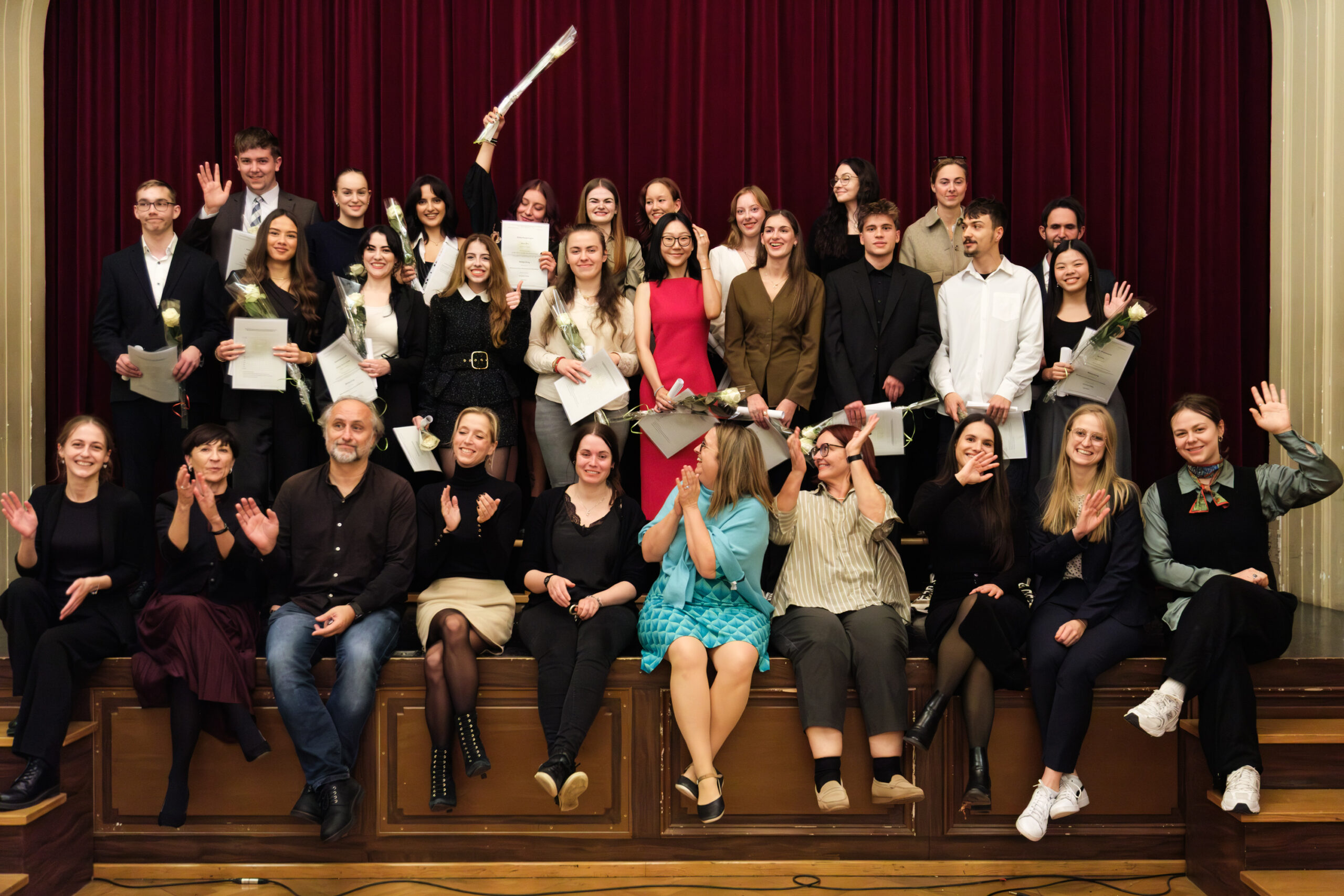 Alle positionierten sich mit weißen Rosen vor dem weinroten Vorhang – ein stimmiges Bild, das im Zweigesang von unseren Musikern mit Freude und Witz untermalt wurde.