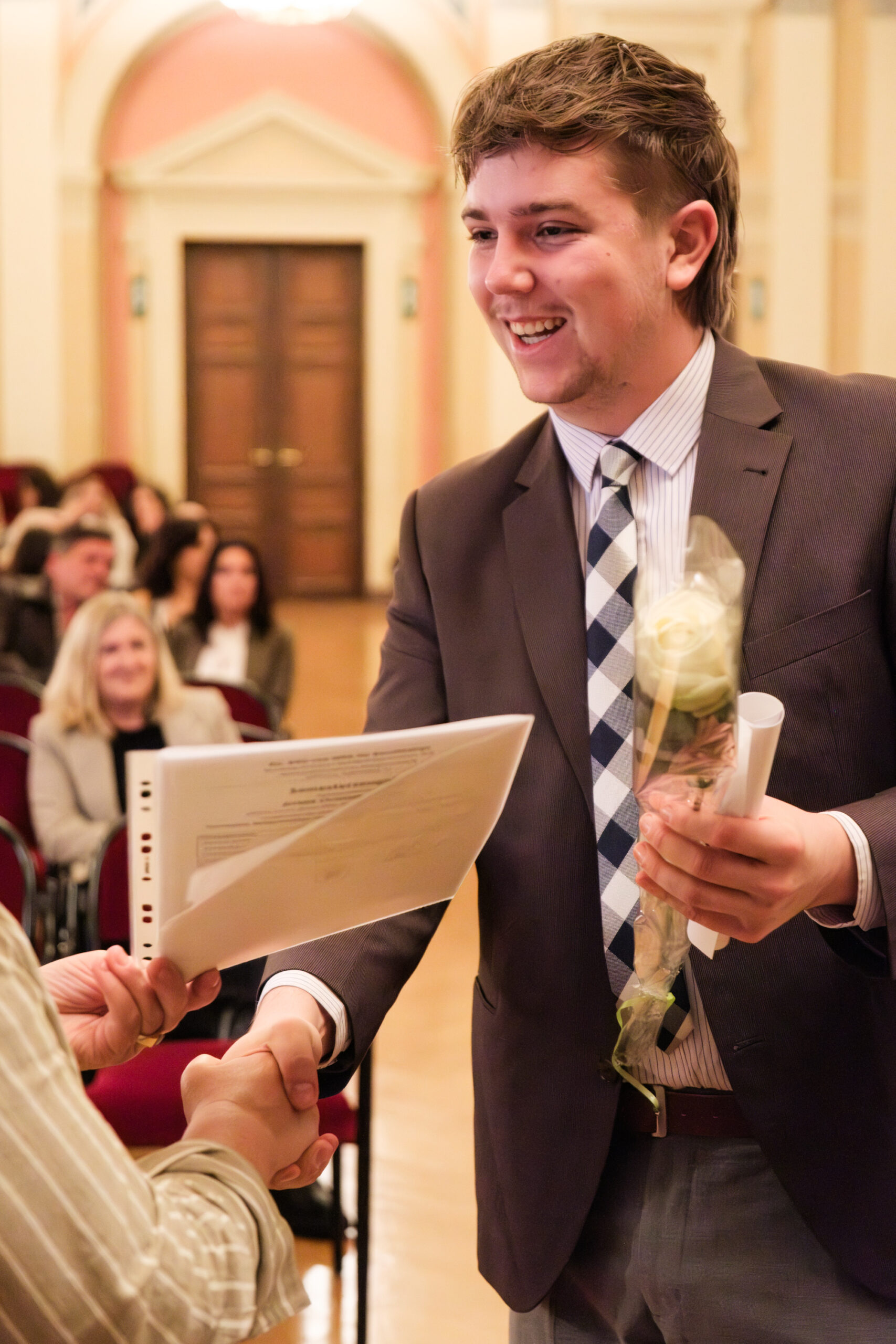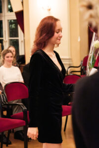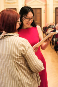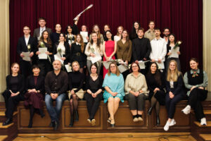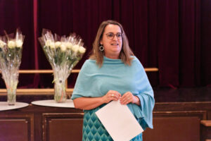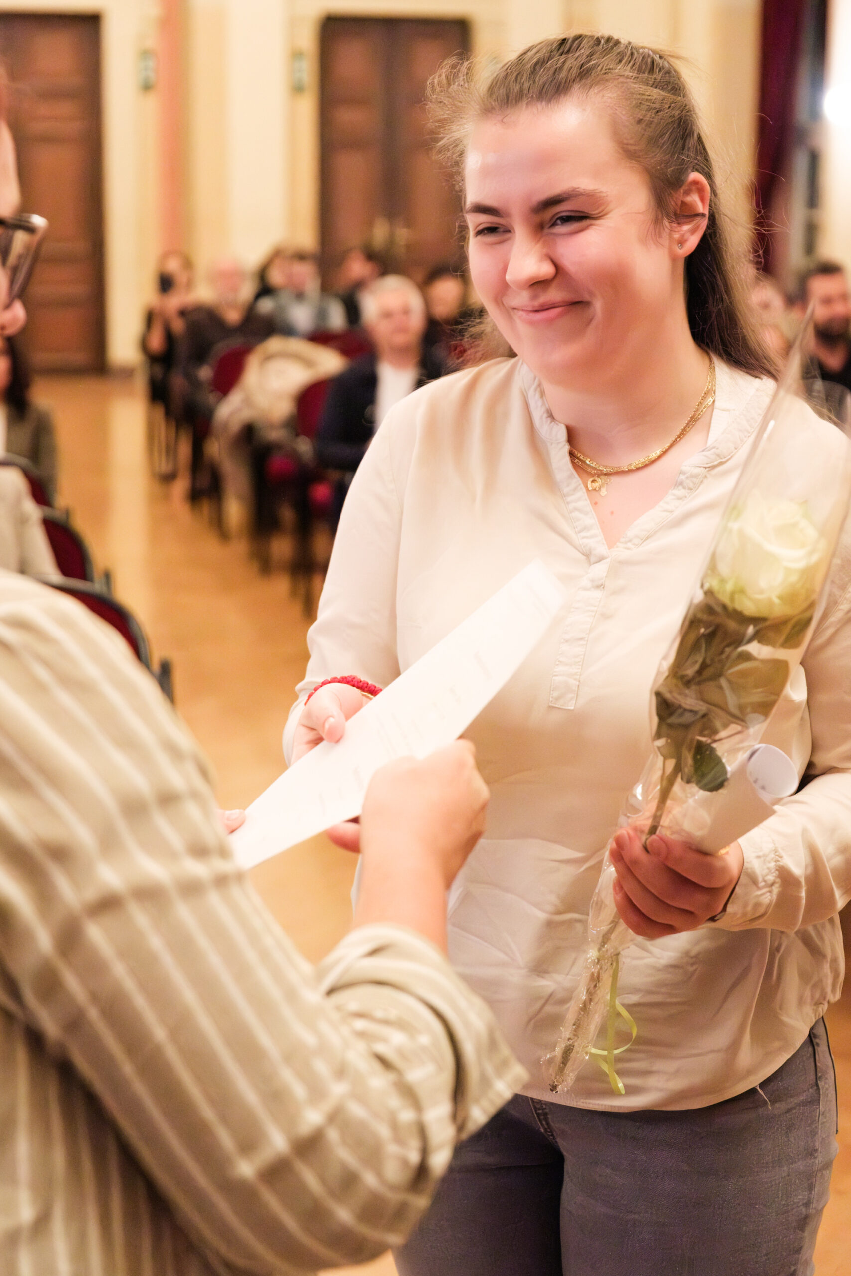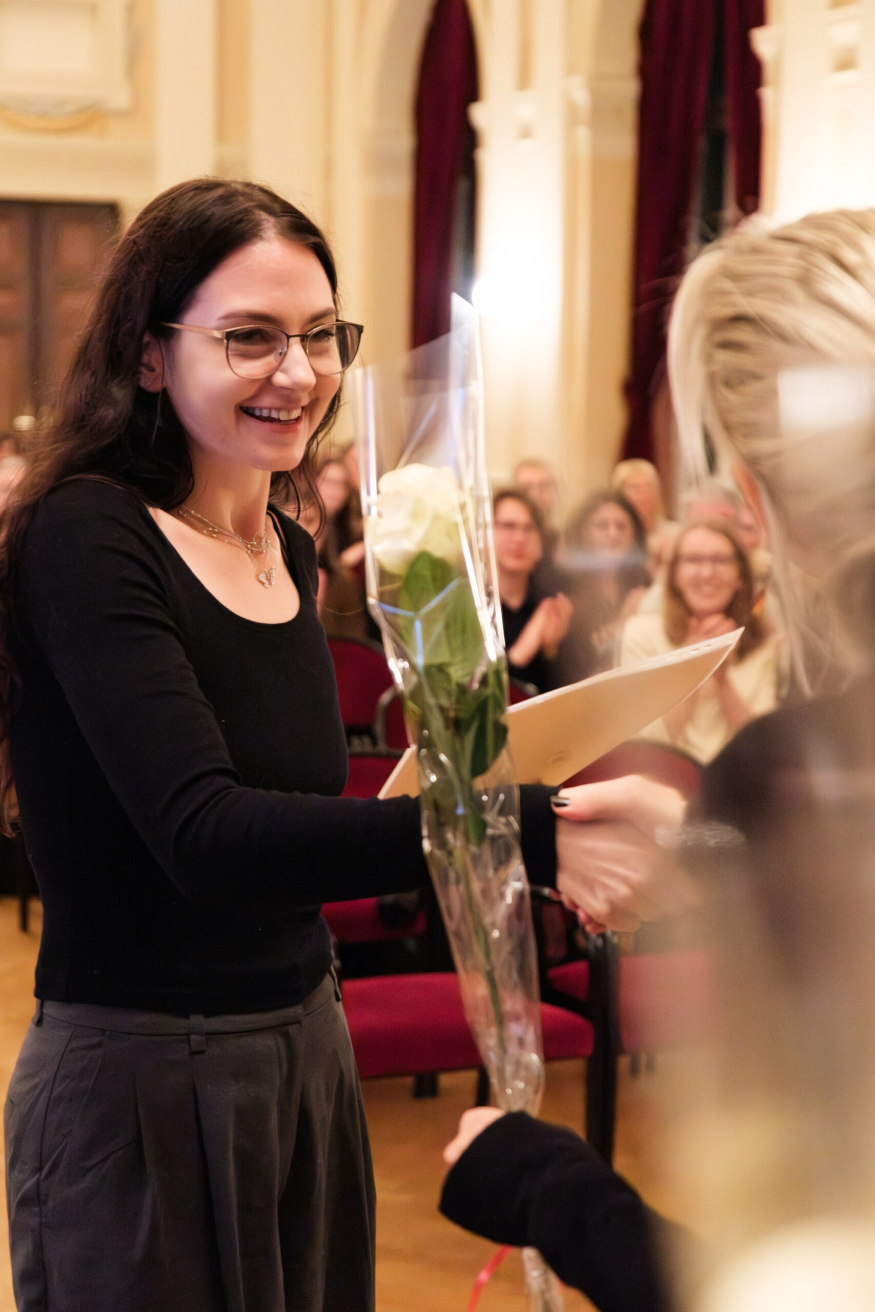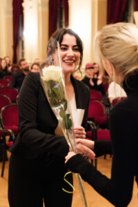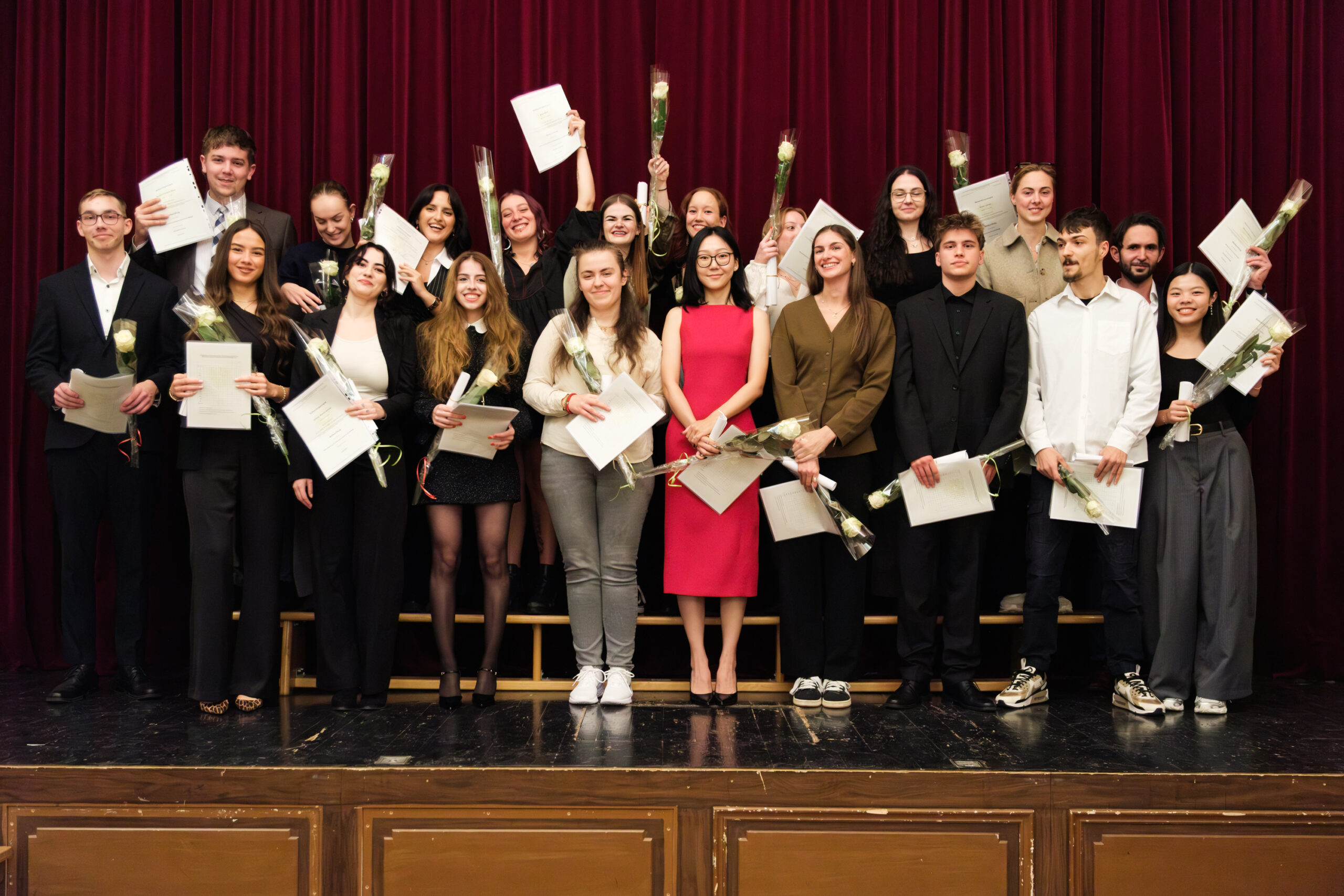 Alle positionierten sich mit weißen Rosen vor dem weinroten Vorhang – ein stimmiges Bild, das im Zweigesang von unseren Musikern mit Freude und Witz untermalt wurde.
