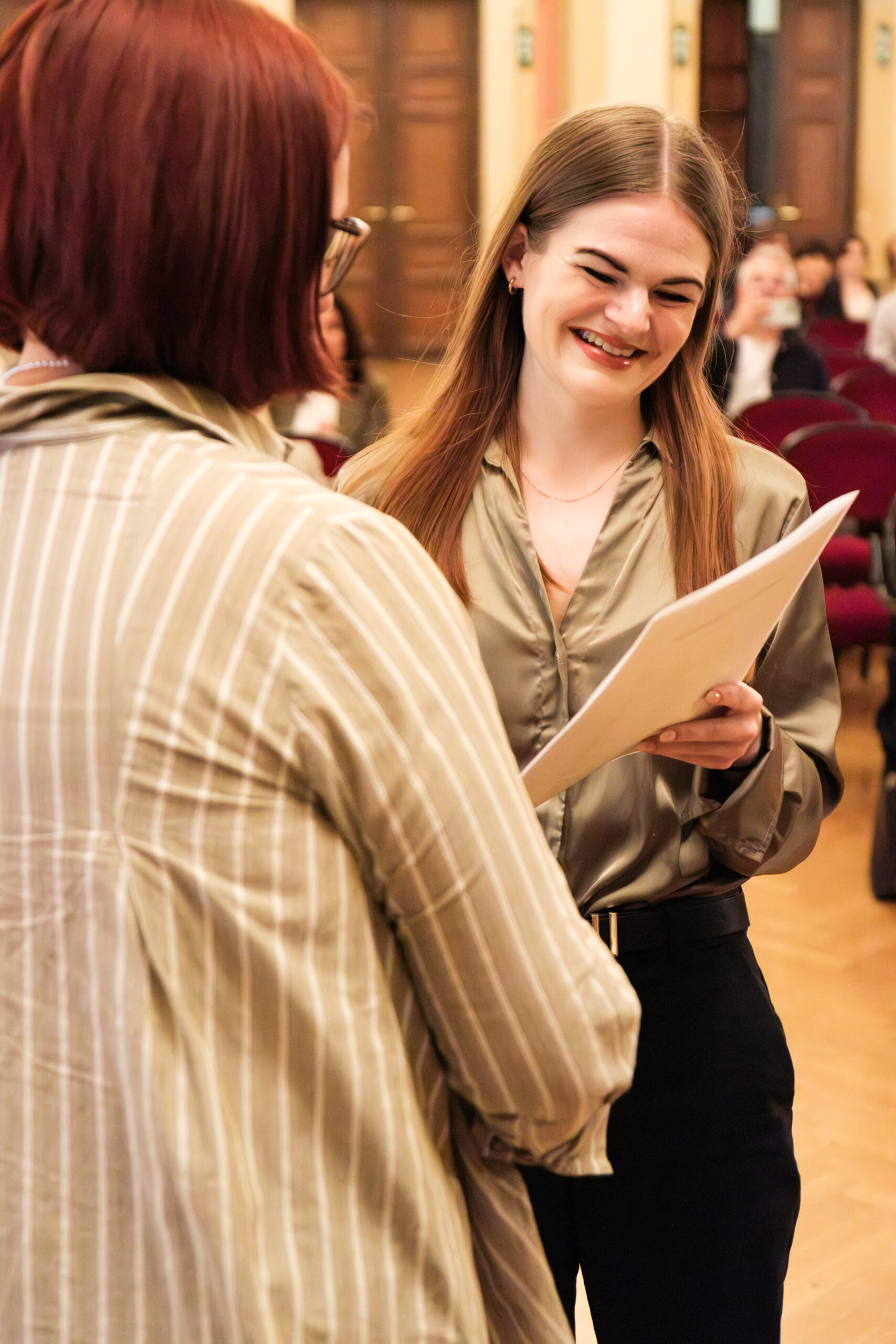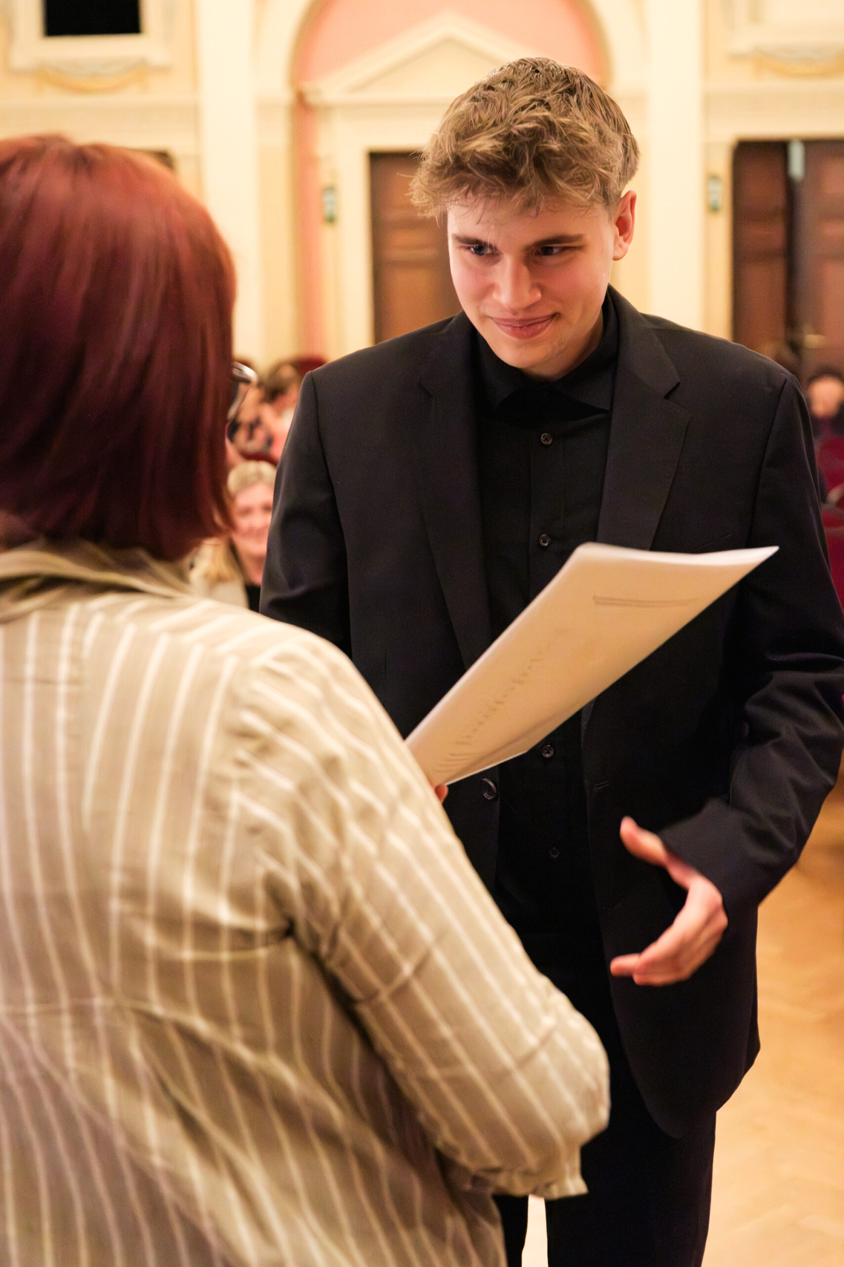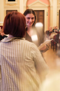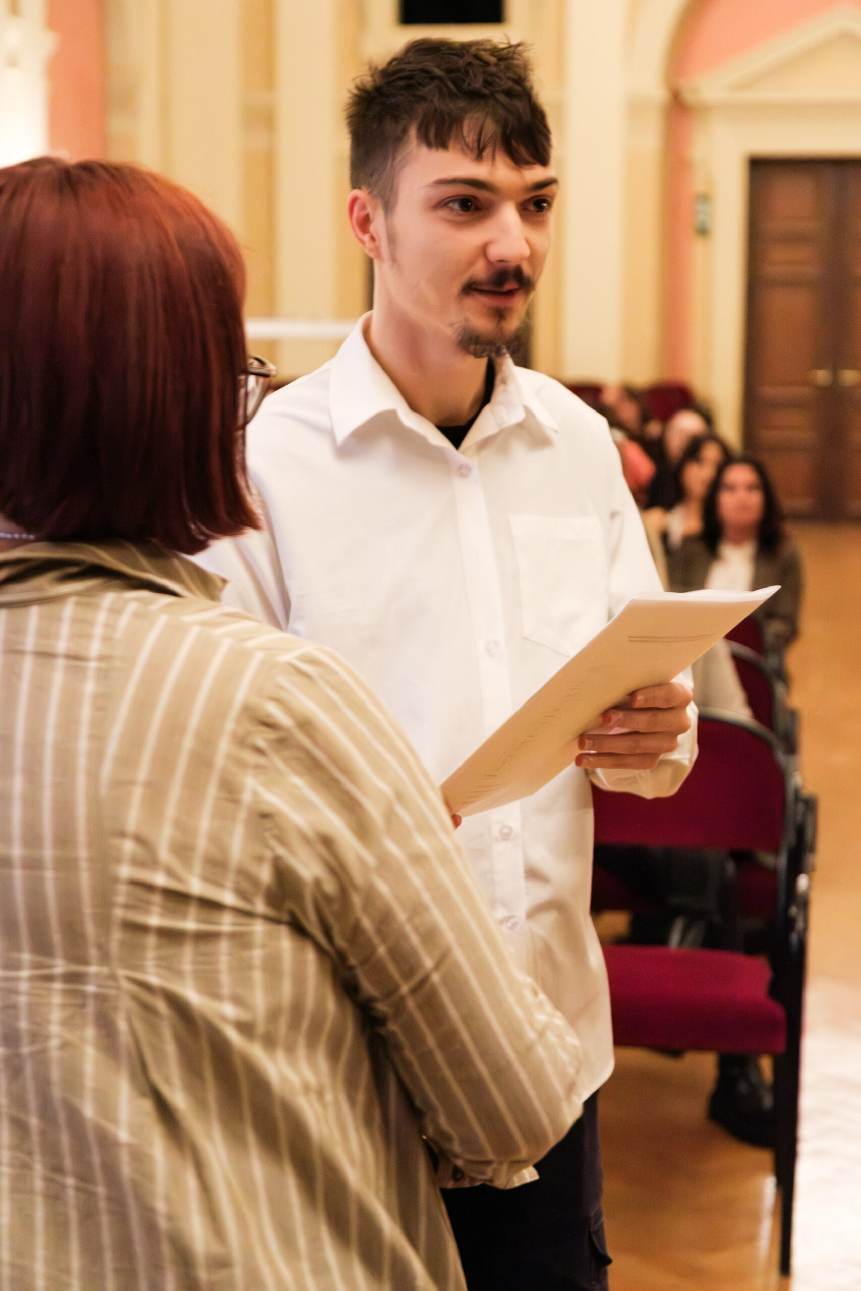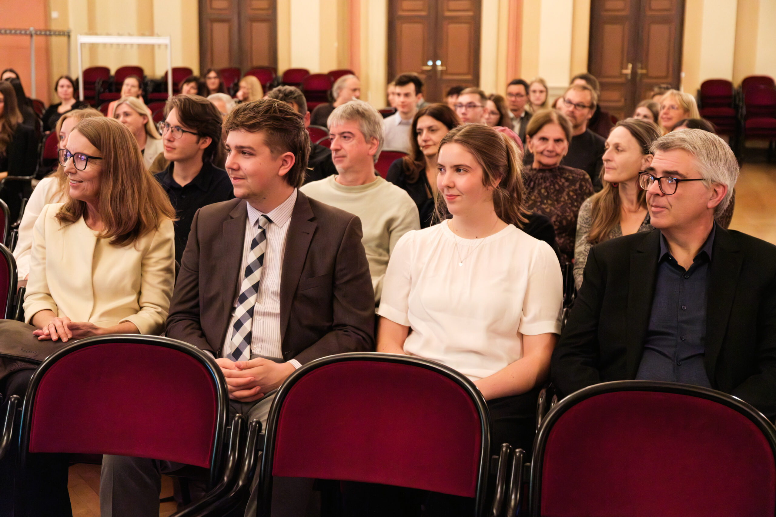 Alle positionierten sich mit weißen Rosen vor dem weinroten Vorhang – ein stimmiges Bild, das im Zweigesang von unseren Musikern mit Freude und Witz untermalt wurde.