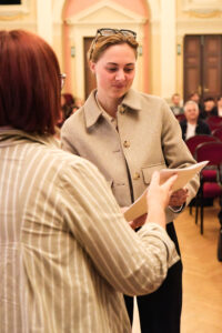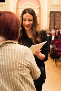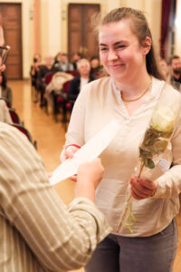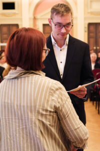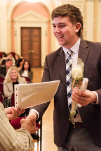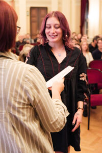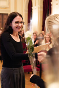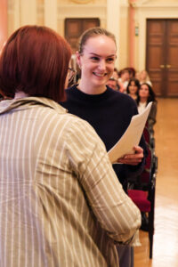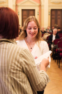 Musikalisch untermalt wurde die Feier am Klavier von unserem Kollegen Florian Eschelmüller mit einer atemberaubenden Kantate von J. S. Bach und einem wundersamen Lied von E. Korngold. Was für eine Stimme und Stimmung! Feierlich: Ich wünsche dir Glück! So herrlich interpretiert. Ein Ohrenschmaus zum Blumenstrauß. Kollege Winterauer spielte an der Gitarre und bot einen Song von Bob Dylan dar, passend zu den Veränderungen, die das Leben mit sich bringt. Auch der Abschluss der Schule ist eine solche. Direktorin Maria-Luise Walser nutzte eine Geschichte rund um einen Seestern, um darzulegen, was letztlich einen Unterschied in unserem Leben macht und Kollegin Lasinger vermittelte auf hoher See der guten Rede allerhand eingängige Bilder zu Chancen, Anknüpfung, Ordnung und Vernetzung.
