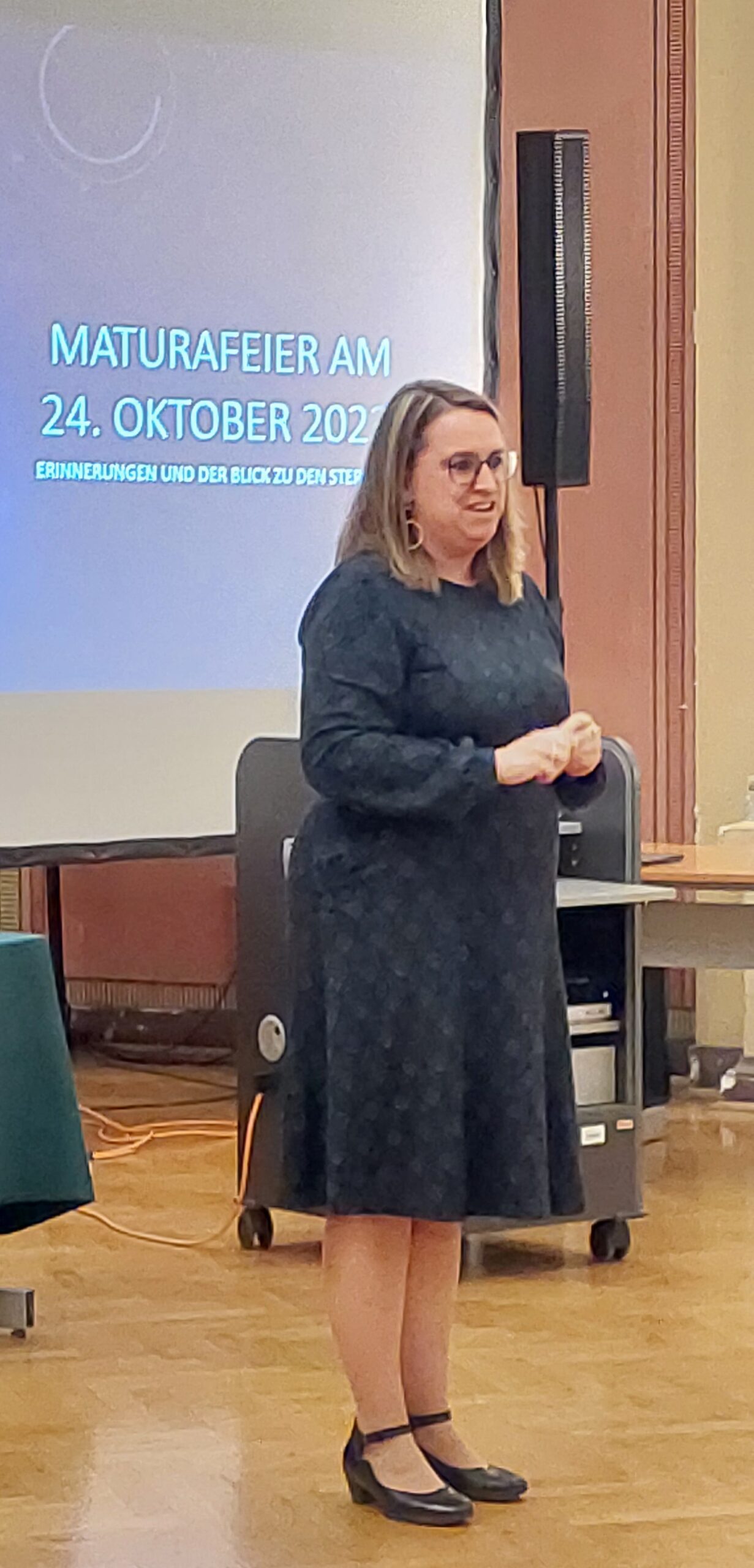 Frau Direktorin Walser begab sich mit ihren Worten anlässlich dieser Sternstunde wieder ins All und erzählte von den Pleiaden, den sieben Schwestern. Auch für uns eine magische Zahl – müssen doch alle Studierenden bei der Matura sieben Prüfungen ablegen. Prof. Lasinger hielt die Maturarede und erinnerte ausgehend von einem Text des Lichtkünstlers Maurizio Nannucci daran, dass uns die Ausbildung an einer AHS dazu anleitet, die Zwischentöne, Schattierungen, Nuancen zu erkennen, die zwischen allen Extremen liegen. Alles ist im Wandel begriffen und nur, wer sich verändert, macht Erfahrungen. Werden ist wichtiger als sein usw.