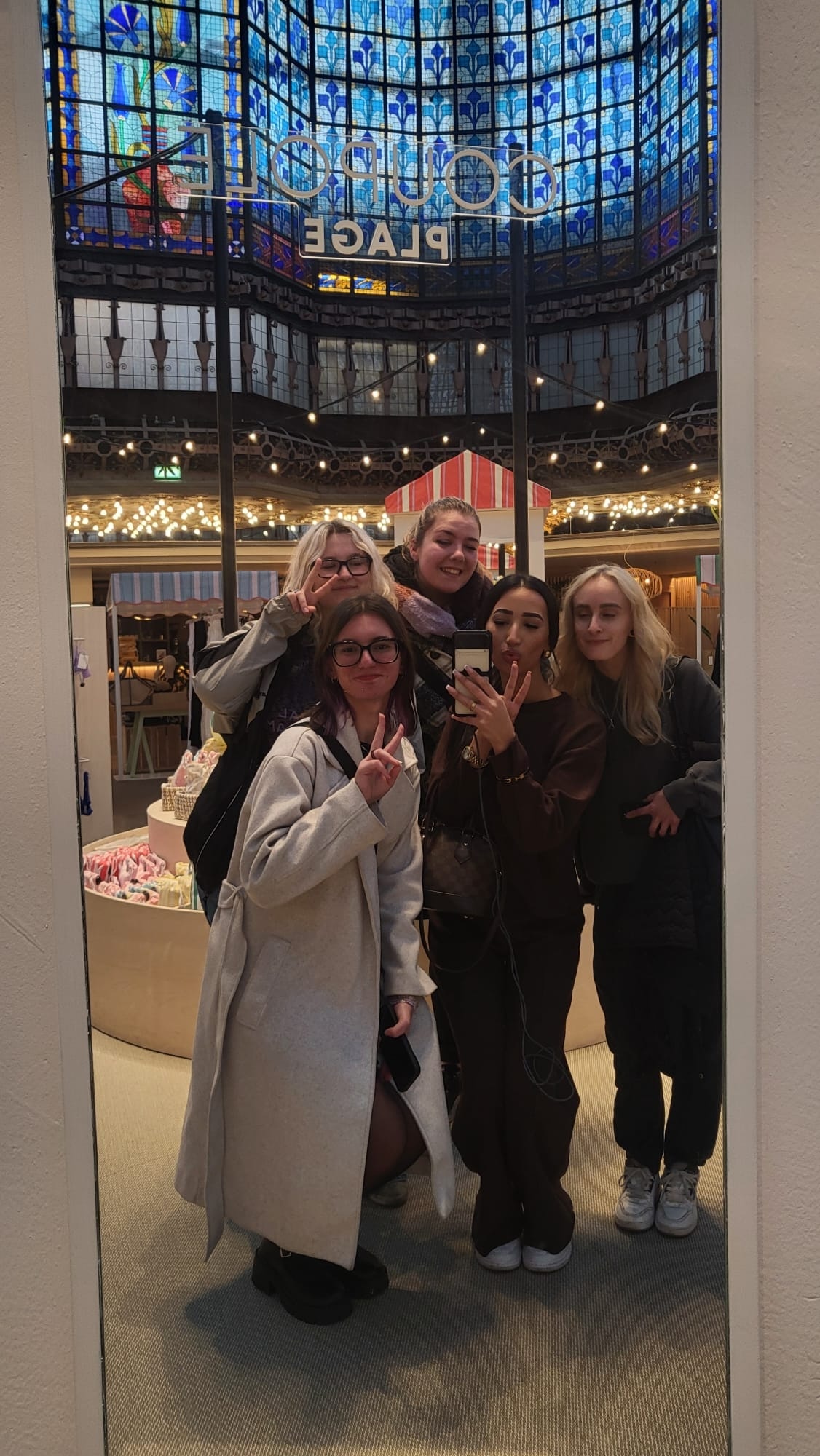 Wir begaben uns im Anschluss an den Unterricht gemeinsam auf die Spuren der Geschichte von Geschäftslokalen: Von den überdachten Passagen im Palais Royal über die windgeschützten überdachten Passagen (Passage Vivienne) bis zu den ersten Großkaufhäusern mit prunkvollen Glaskuppeln wie Printemps und Galeries Lafayette, zu denen es in Österreich kein Pendant gibt. Thematisiert wurden einerseits die Bedürfnisse der Konsument/-innen, andererseits die Biografien bekannter Modedesigner. Vor dem kofferförmigen Geschäftslokal von Louis Vuitton erfuhren die Schüler/-innen die Geschichte des Aufstiegs des kleinen Jungen vom Land, von der Art zu reisen im 19. Jahrhundert, vom Einfluss des Zugfahrens auf „Verpackungen“. In der Galerie Dior wurde die Bedeutung der Mode noch einmal aufgegriffen. Die Modeindustrie ist einerseits ein wesentlicher Wirtschaftsfaktor in Frankreich, Mode ist aber auch Kunst und Kunsthandwerk, weshalb die Präsentation von Modellen aller großen Modeschöpfer im Louvre dieses Thema gut abrunden konnte. Hier kommunizierten die Modelle mit Gemälden, Wandteppichen und Tapeten im Hintergrund, passten sich an oder bildeten Kontrapunkte.
