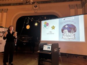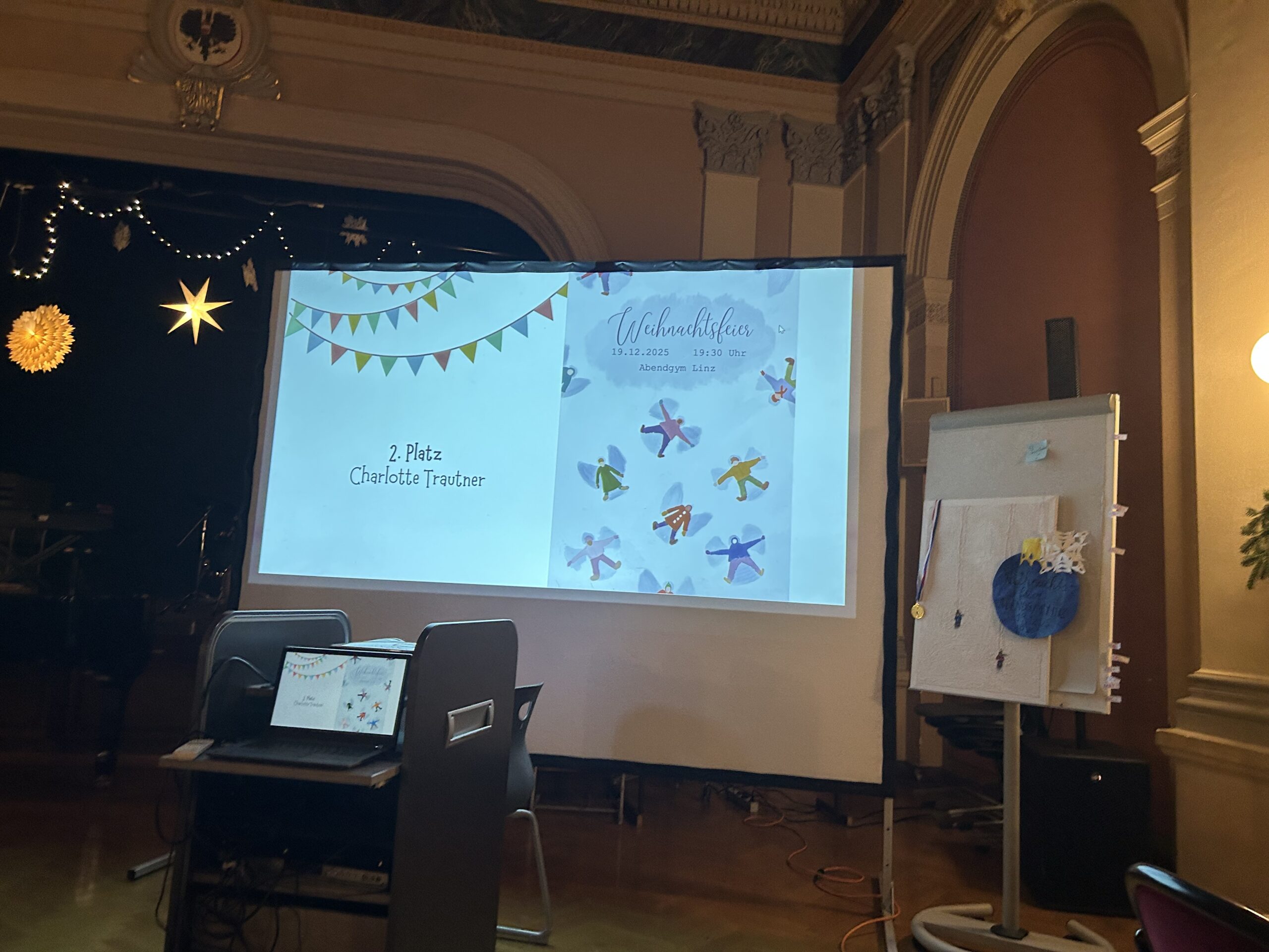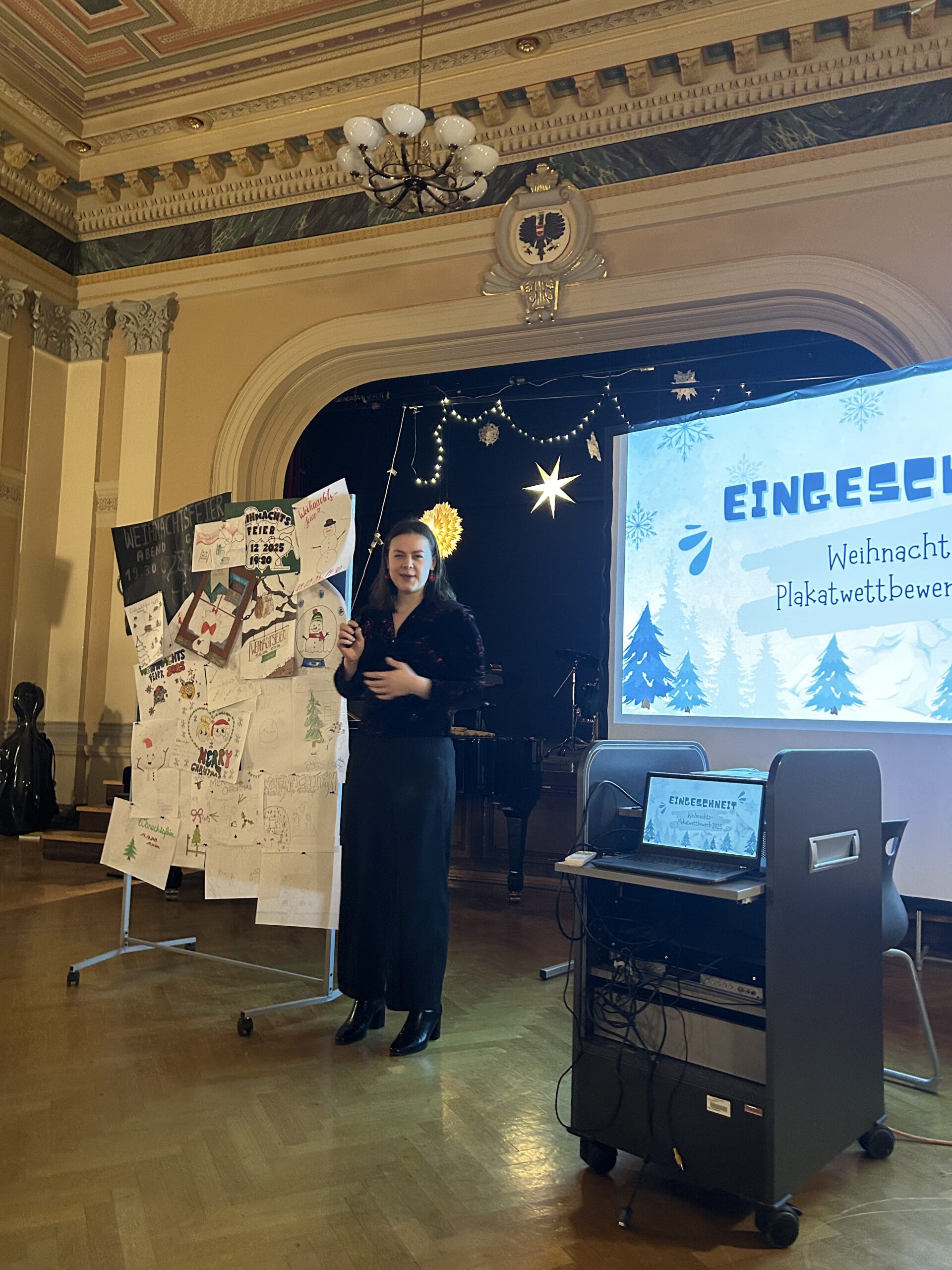 Die Künstler/-innen unserer Schule, die am Plakatwettbewerb teilgenommen haben, haben sich der Herausforderung gestellt, passend zum Motto der Feier Schnee zu malen. Unsere Kunst-Lehrerin Bibiana Fabian nahm die Preisverleihung vor. Die besten drei analogen und die besten drei digitalen Werke wurden mit Malutensilien gewürdigt.
